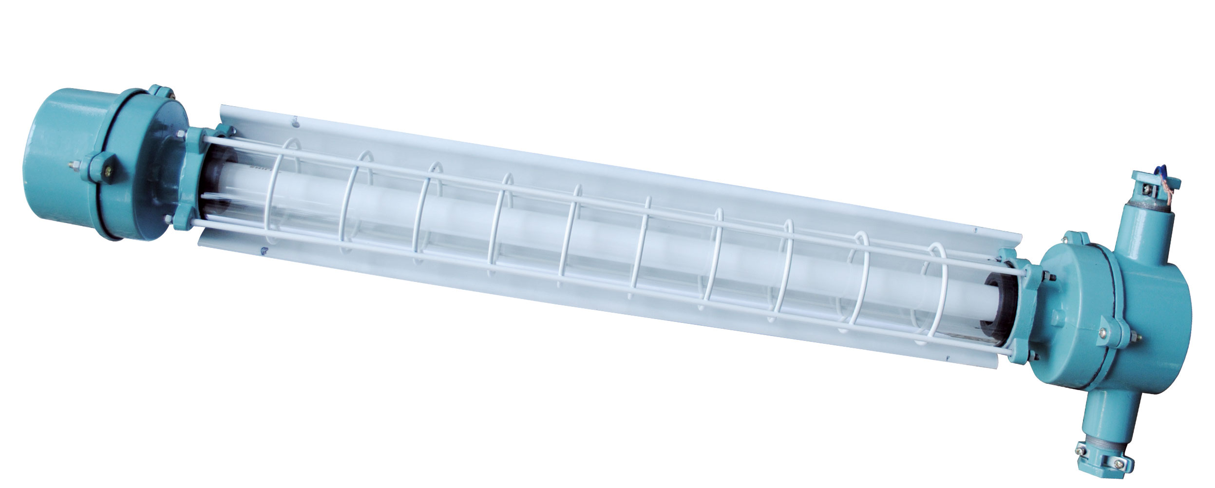 熒光燈由前燈體、后燈體及光源、防爆玻璃罩、金屬防護(hù)罩等部分組成。前燈體由鋁合金外殼、蓋、啟輝器、插座等部分組成,前端蓋上設(shè)有電纜引入裝置和外接地螺釘。后燈體由鋁合金殼、蓋、鎮(zhèn)流器、插座等部分組成。光源腔與接線腔,燈具內(nèi)腔與外界均有符合規(guī)定的防爆接合面防爆。